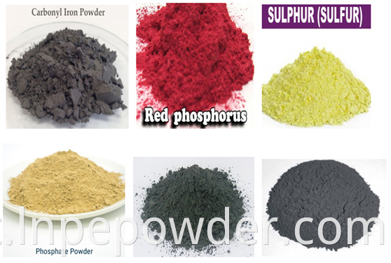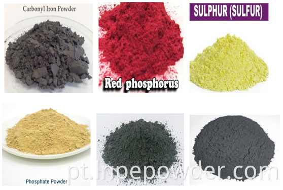 Os materiais típicos: pó de ferro carbonilo, p hosphorus vermelho, enxofre, fosfato, pó de metal, NdFeB, RDX, cobalto em pó, etc.